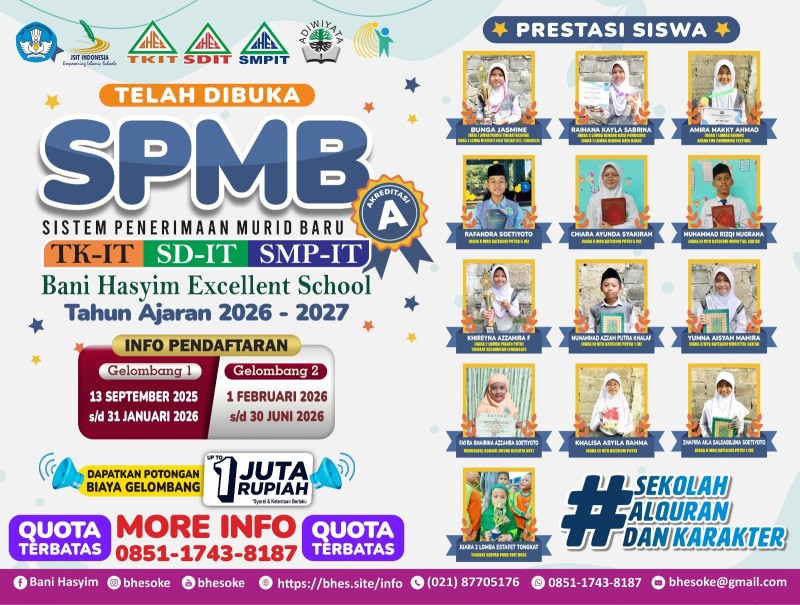 Selamat Datang di Sistem Penerimaan Murid Baru (SPMB) Bani Hasyim Excellent School. Tempat yang tepat untuk Membentuk generasi Qur’ani yang berkarakter, mandiri, dan berprestasi melalui pendidikan Islam terpadu yang unggul dan berkelanjutan.